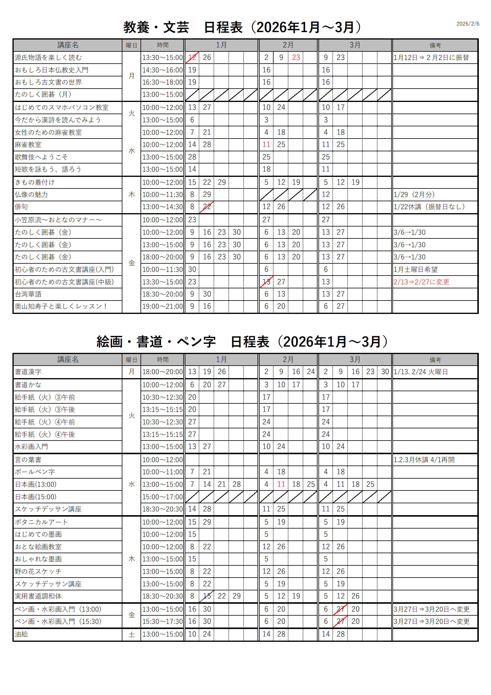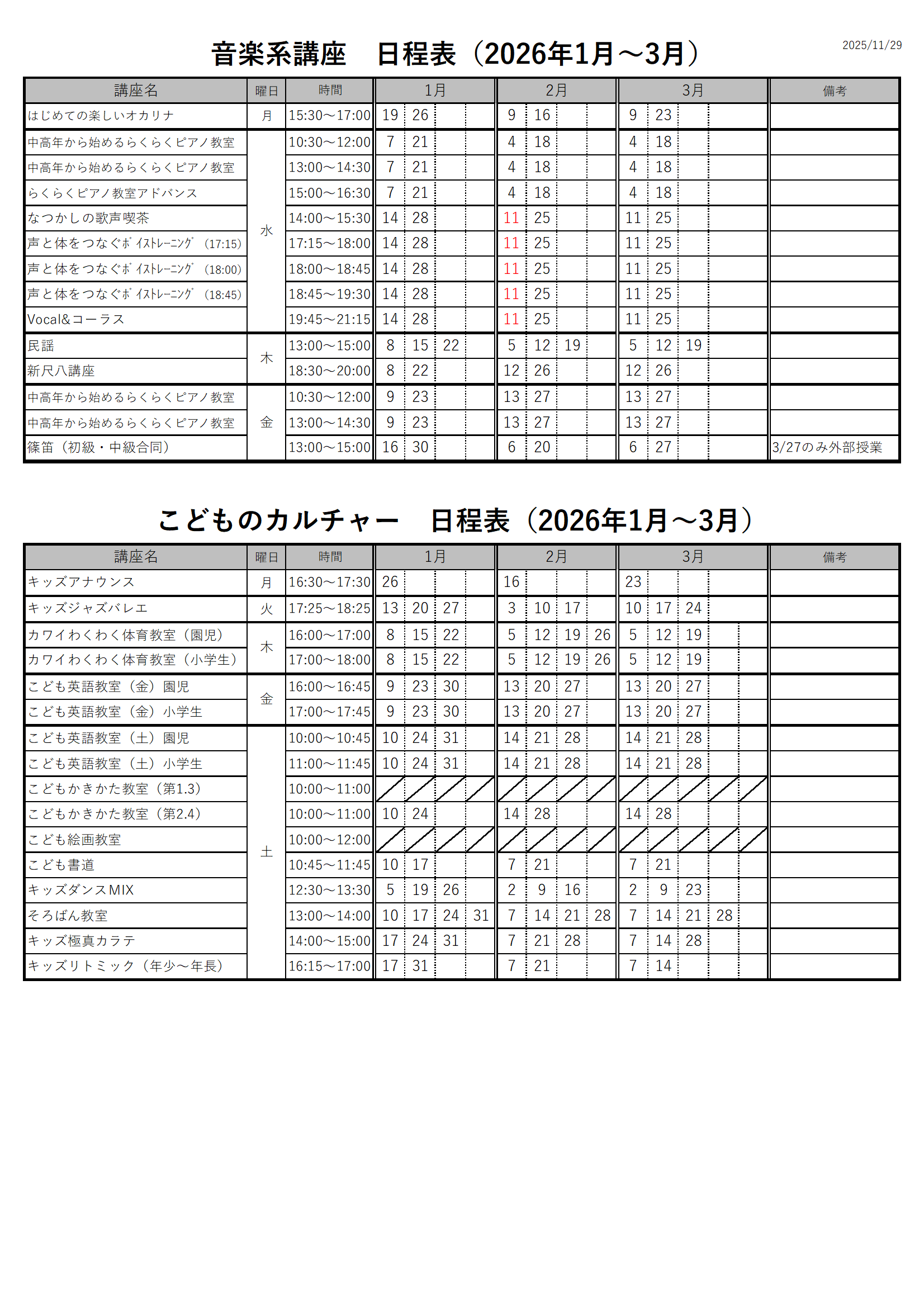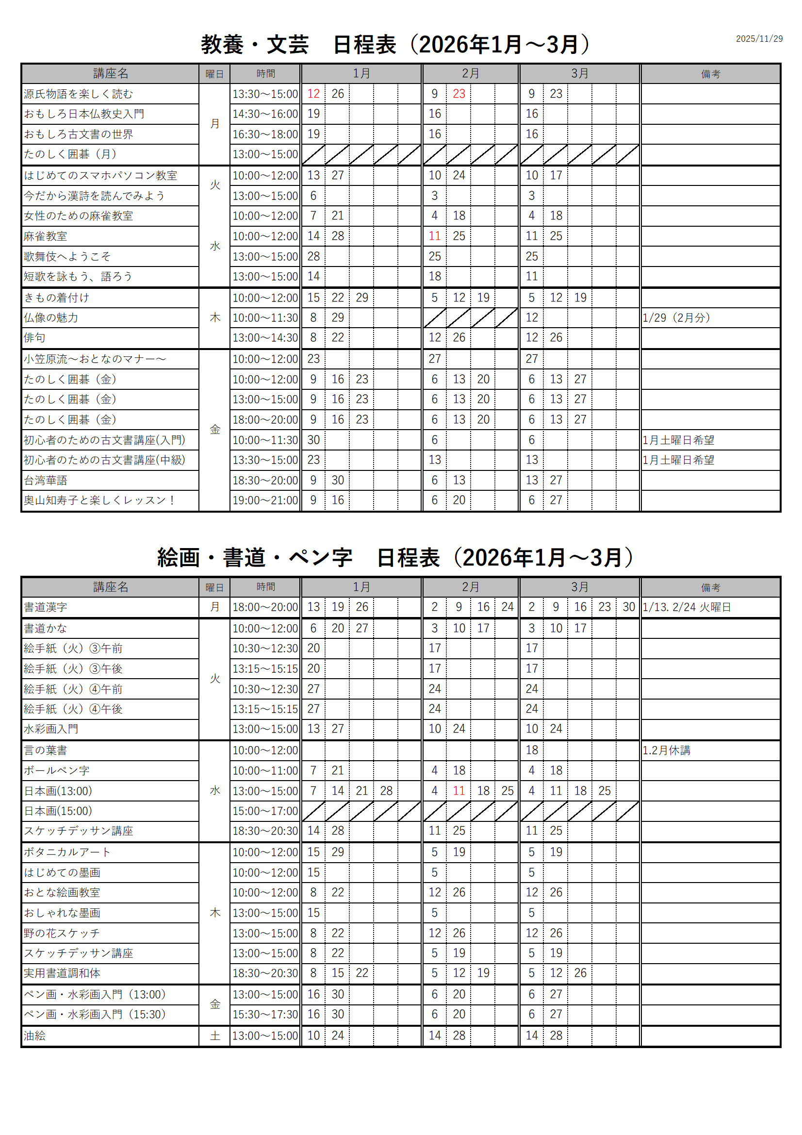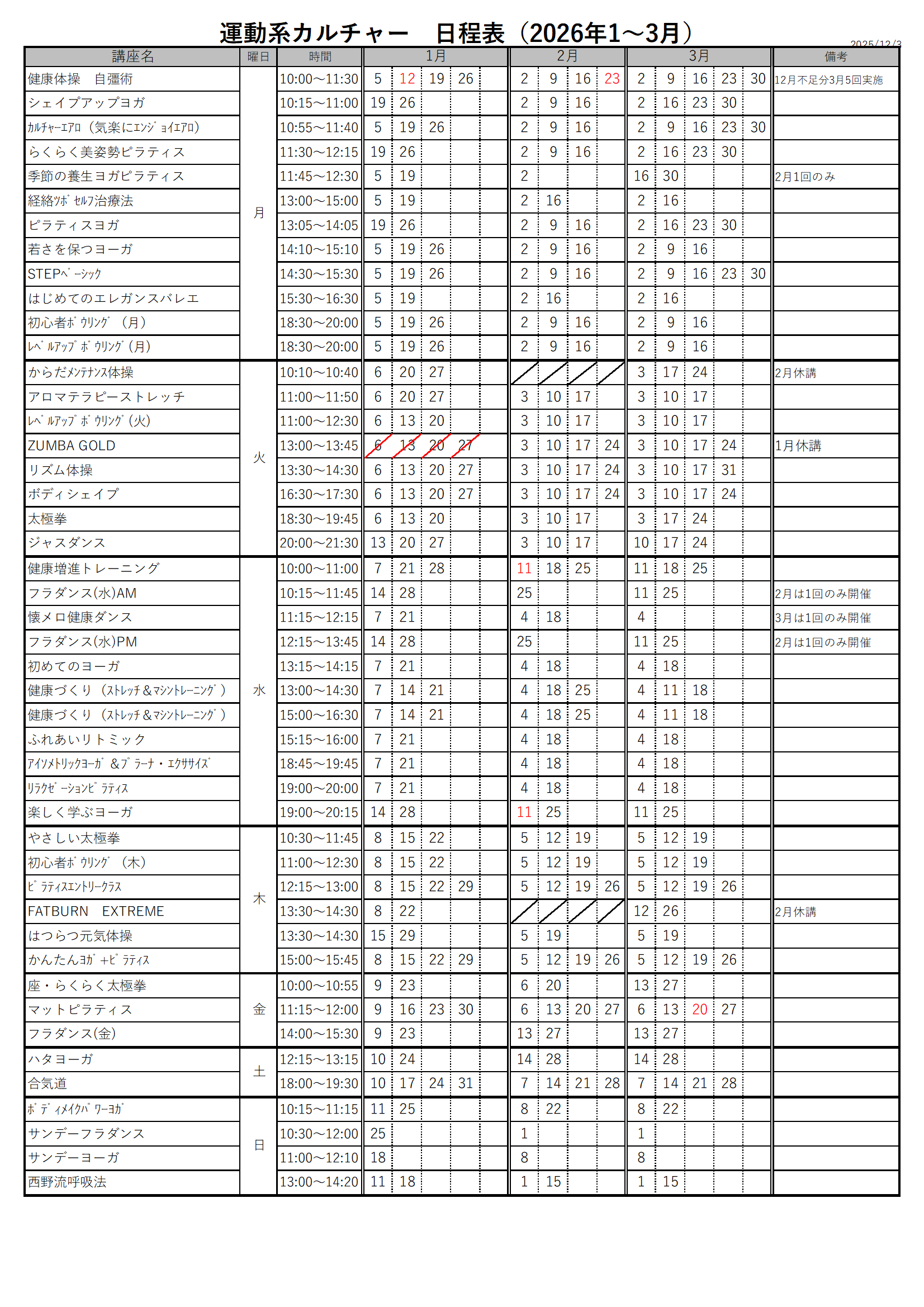 1月~3月の講座日程が確定いたしました。